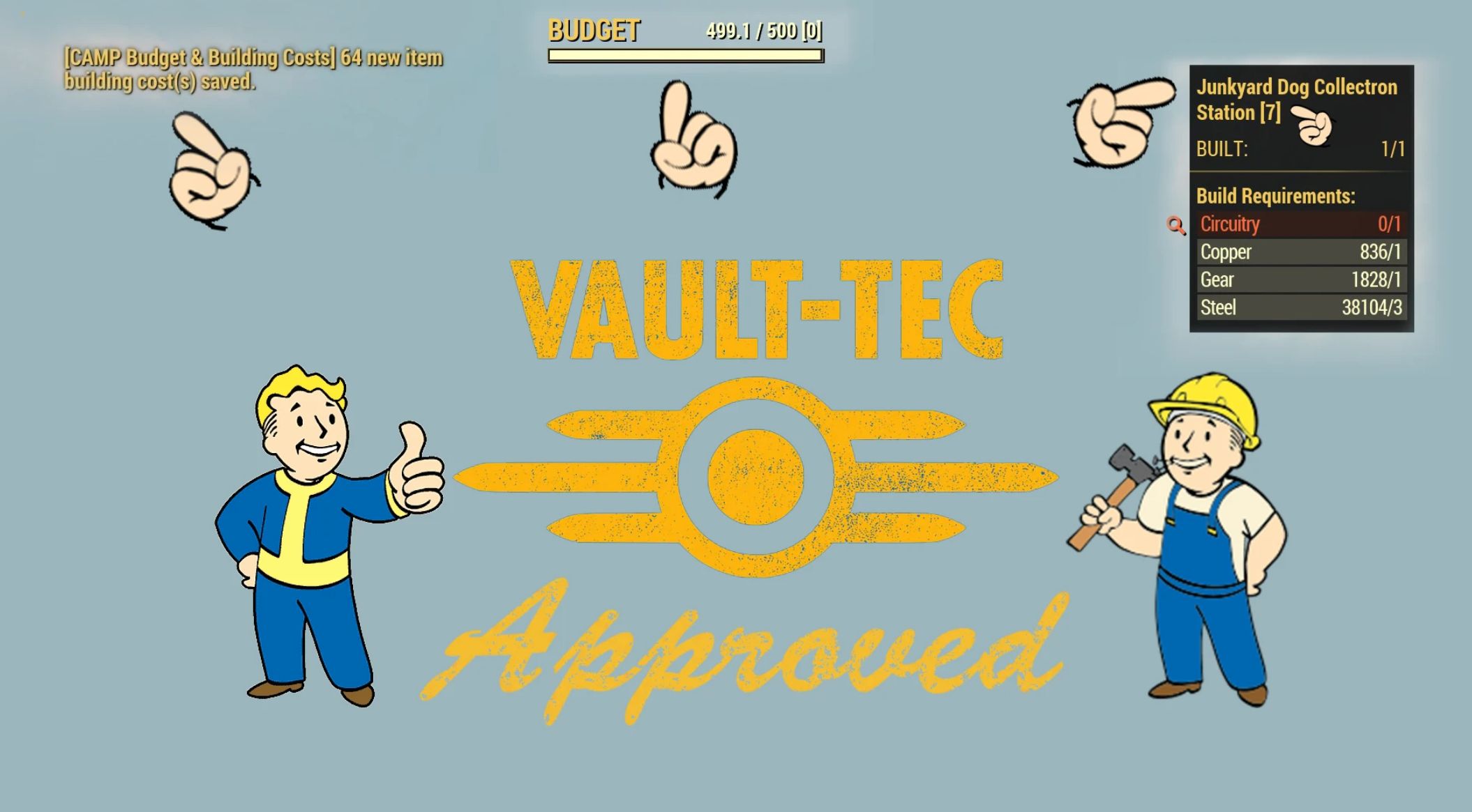 – Place the CampBudgetAndBuildingCosts.ba2 file into: Fallout76/Data/